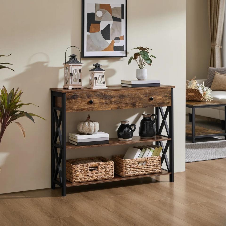 Mesa Consola Moderna Marrón con Cajón, Estructura de Hierro, Mueble de Sala de Estar, Diseño en X para Entrada