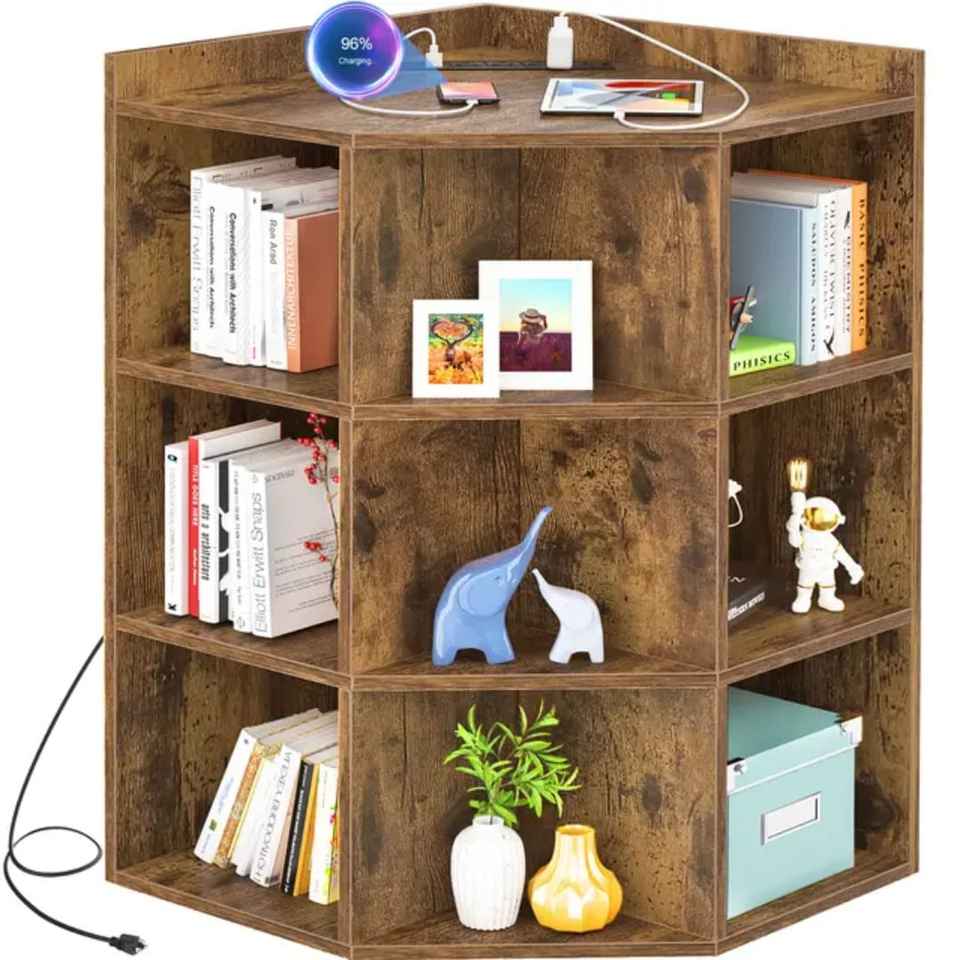 Estantería Esquinera Rústica Marrón con Regleta Integrada y Puertos USB, Estante de Almacenamiento Industrial de 3 Niveles para Dormitorio u Oficina