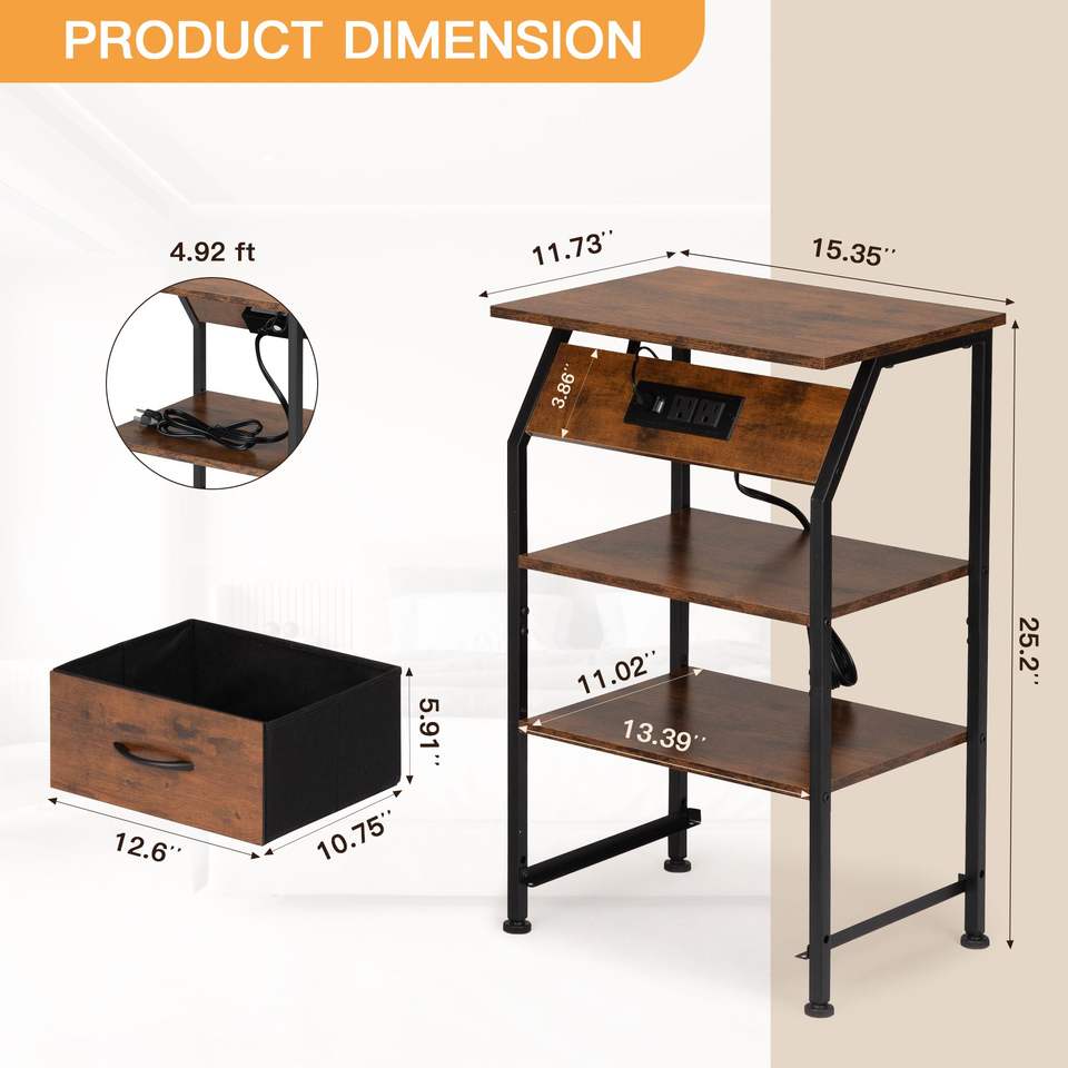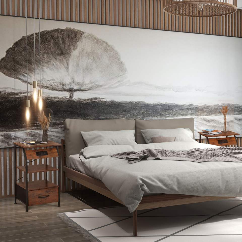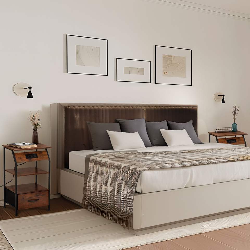 Mesita de noche con puerto USB marrón rústico con luces LED Control remoto y salidas para dormitorio Sala de estar Oficina-Mesitas de noche