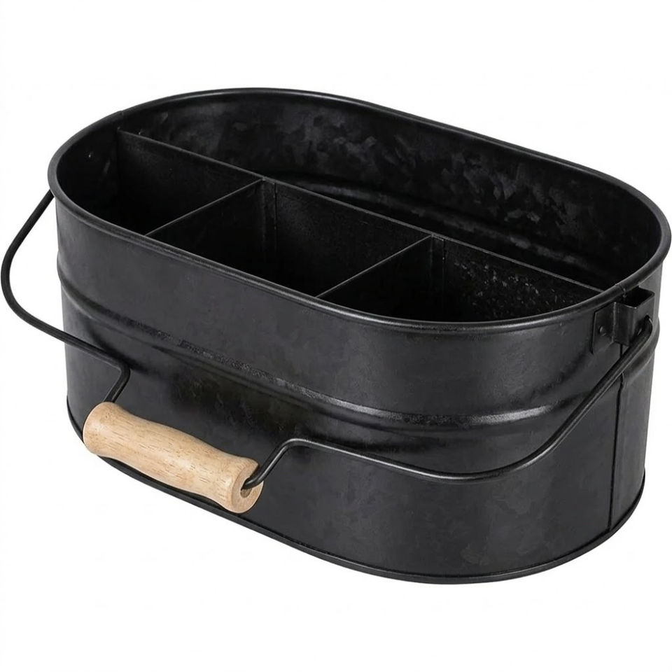 Porta cubiertos y utensilios de metal galvanizado estilo rústico de 5 compartimentos con asa de madera para mesa de comedor de cocina.