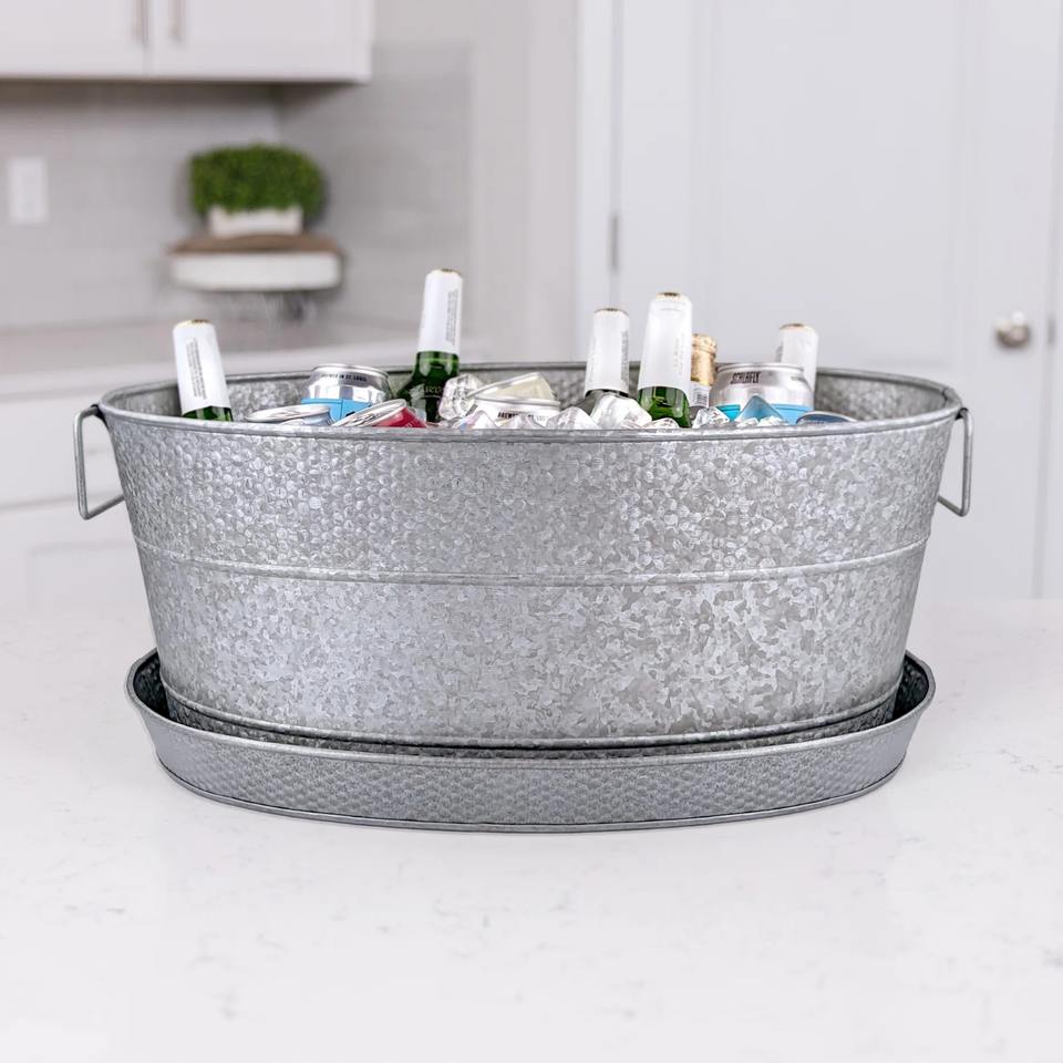 Enfriador de bebidas ovalado de metal estilo rústico para fiestas al aire libre, estación de bebidas con cubo de hielo galvanizado de alta capacidad