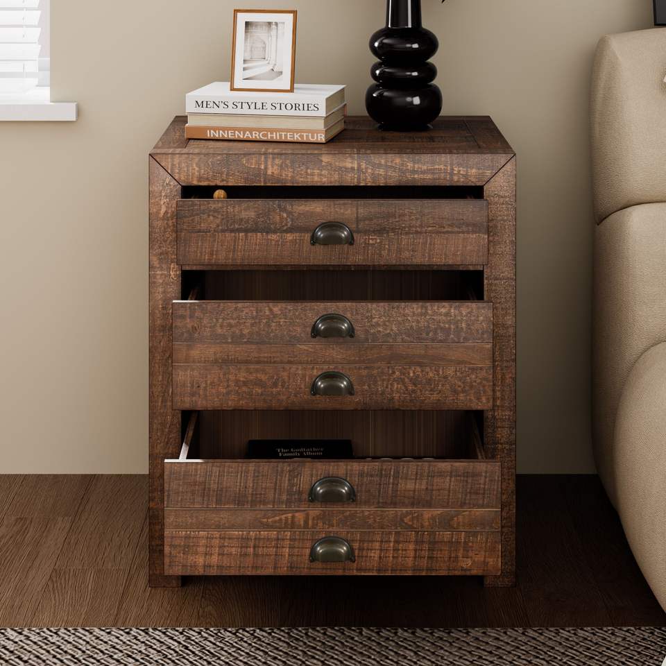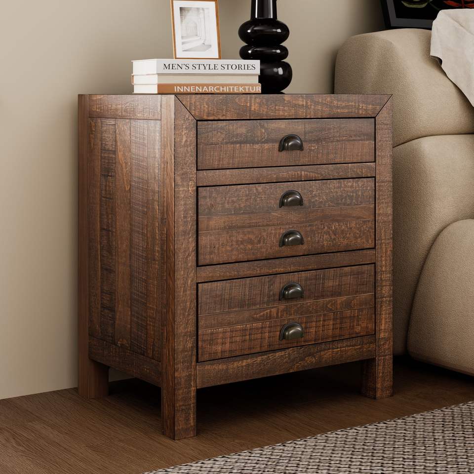 Mesita de Noche Rústica Estilo Granja de Madera de Pino Maciza con Tres Cajones, Estación de Carga Integrada y Tiradores de Copa