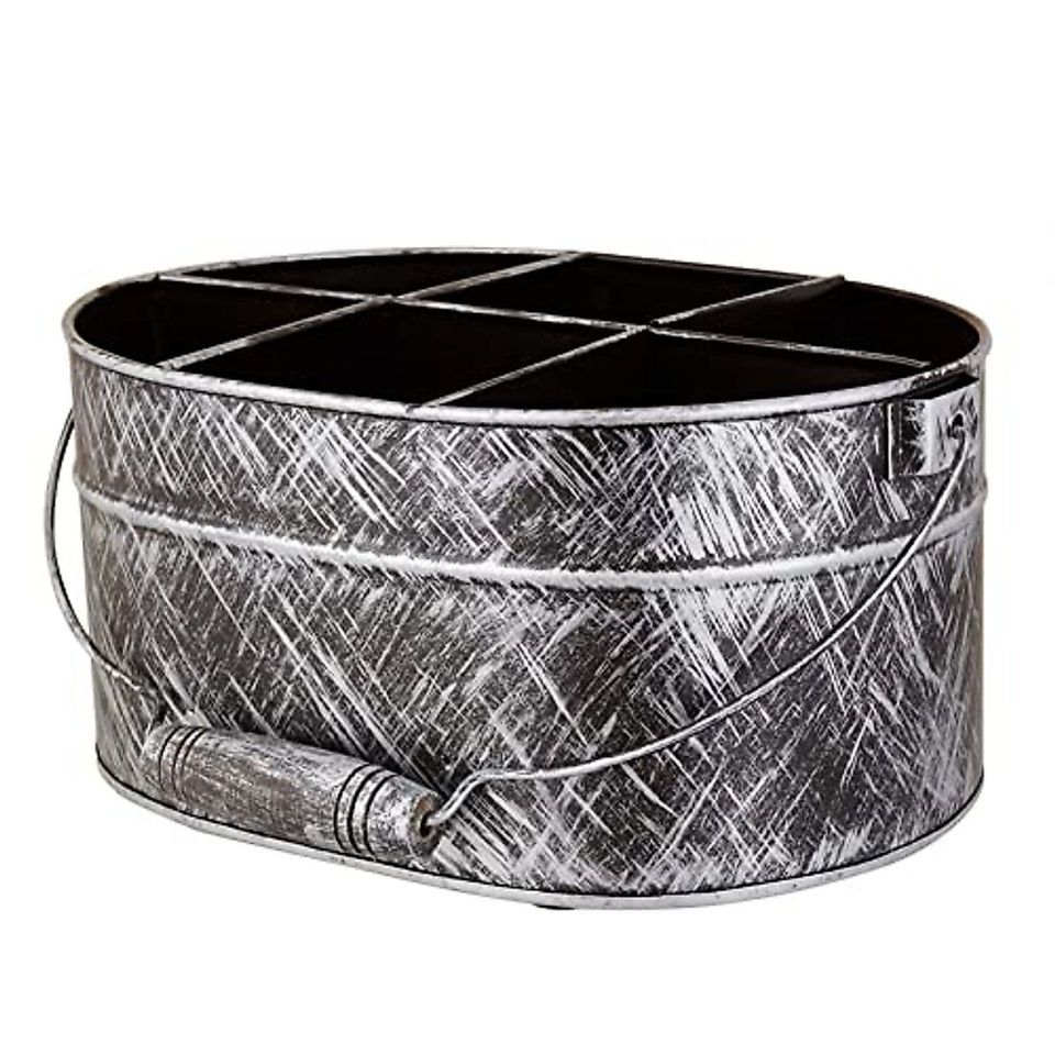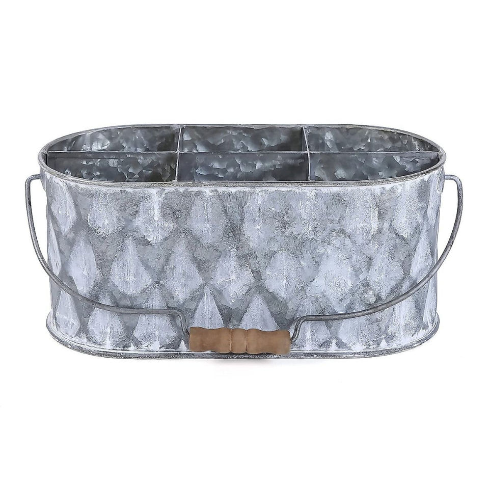 Porta Utensilios Rústico de Metal Galvanizado con Asa de Madera, 3 Compartimentos, Organizador Portátil de Cubiertos para Cocina y Comedor