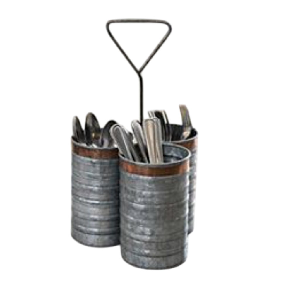 Portautensilios y organizador de cubiertos de metal galvanizado rústico, duradero, con 3 compartimentos, para almacenamiento en la encimera de la cocina o comedor.