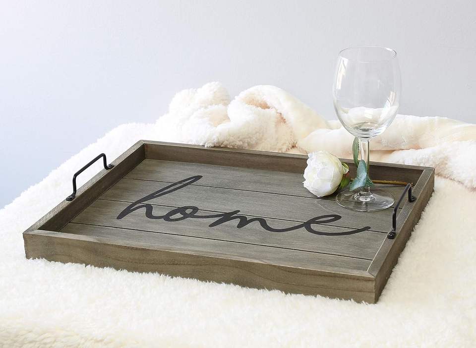 Bandeja de Servir de Madera con Diseño Serigrafiado en Color Gris Rústico y Asas de Hierro Negro, Más Duradera y Confiable, Bandeja para Dulces