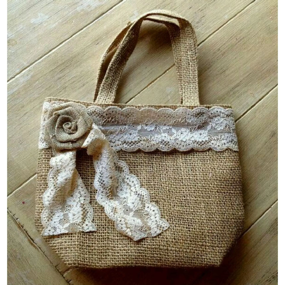 Bolsa de Yute Rústica con Encaje y Rosa, con Lazo de Tela y Ribete de Encaje en Tono Natural, Diseñada para un Uso Diario Elegante