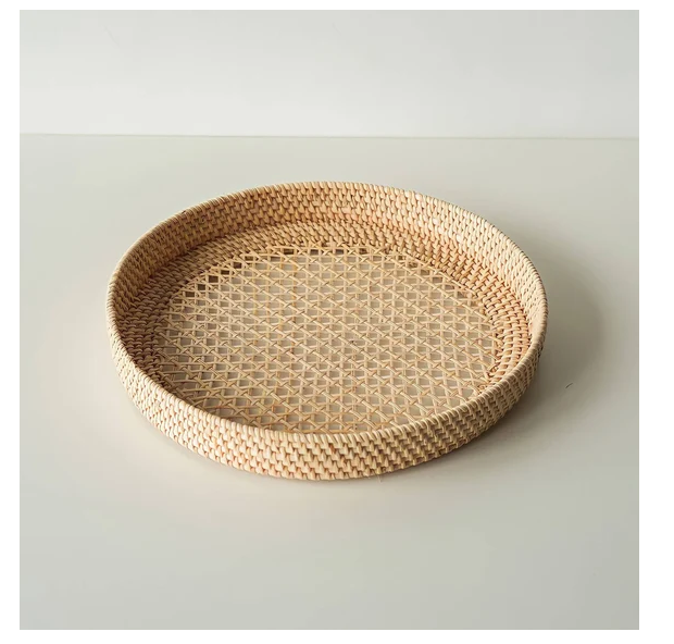 Bandeja de servir y almacenamiento rústica de ratán tejido con asa para café, aperitivos, desayuno, estilo rústico, para uso en la cocina.