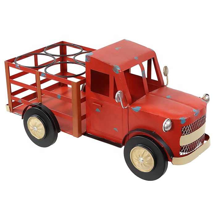 Soporte de estante de vino de encimera de hierro con hoja de camión de Metal rojo rústico para tiendas de fiesta 4 botellas de licor de vino