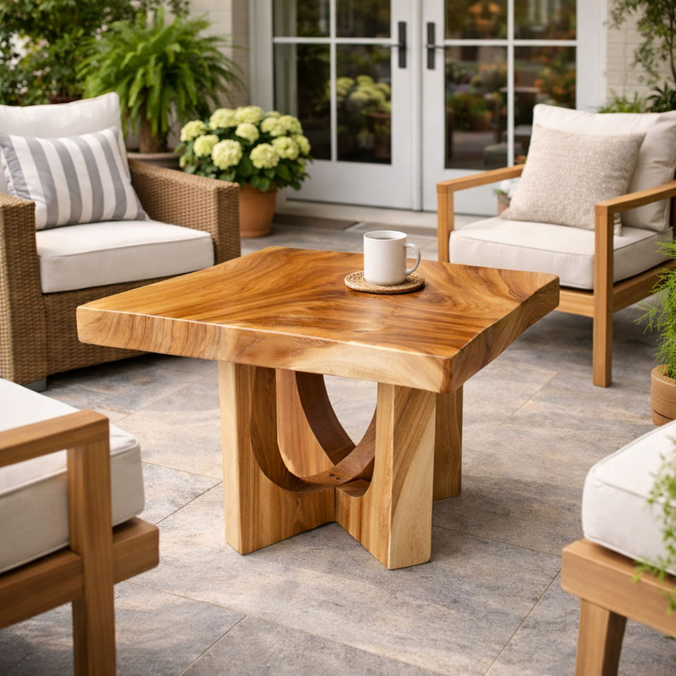 Mesa Decorativa Rústica con Pedestal Escultural, Diseño Único en Madera Suar de Alta Calidad, Pulida, con Patas Delicadas y Forma Especial para Decoración del Hogar