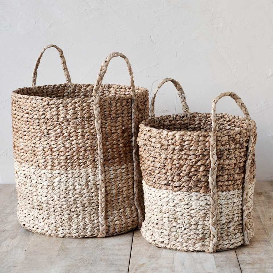 Juego rústico de cesto de ropa con jacinto de agua trenzado de colores con asas, soporte para maceta de paja, cesto de almacenamiento de algas marinas