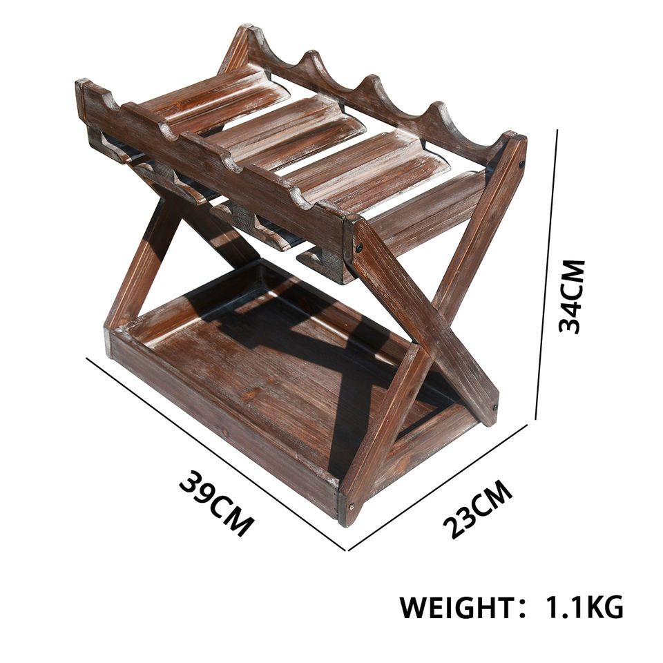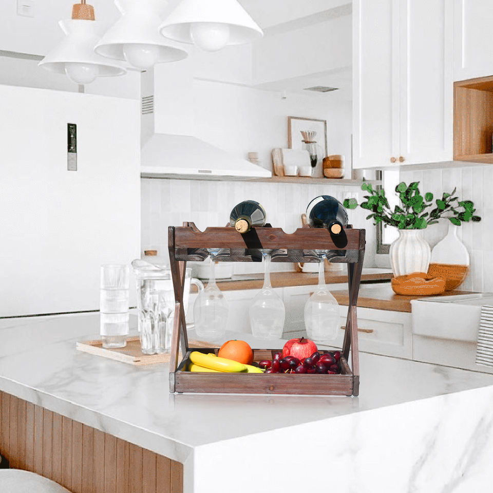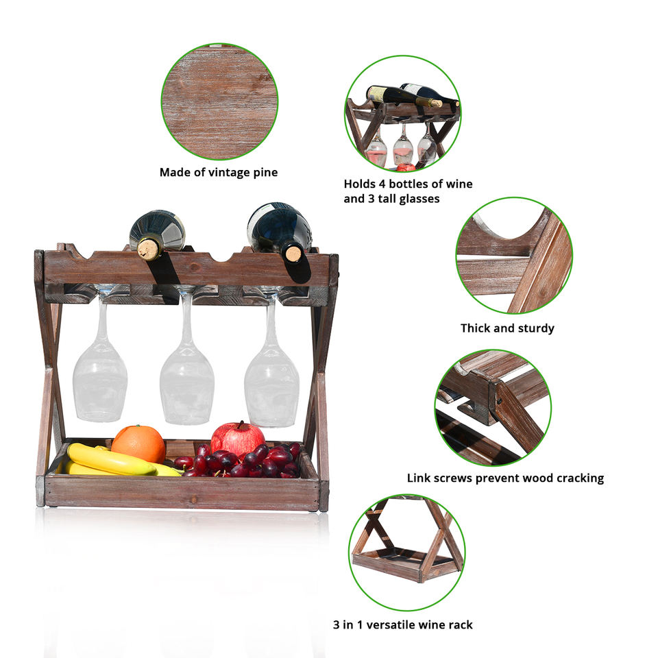 Rústico Estado Cava Encimera Estante de vino de madera maciza para 4 botellas y 6 portavasos