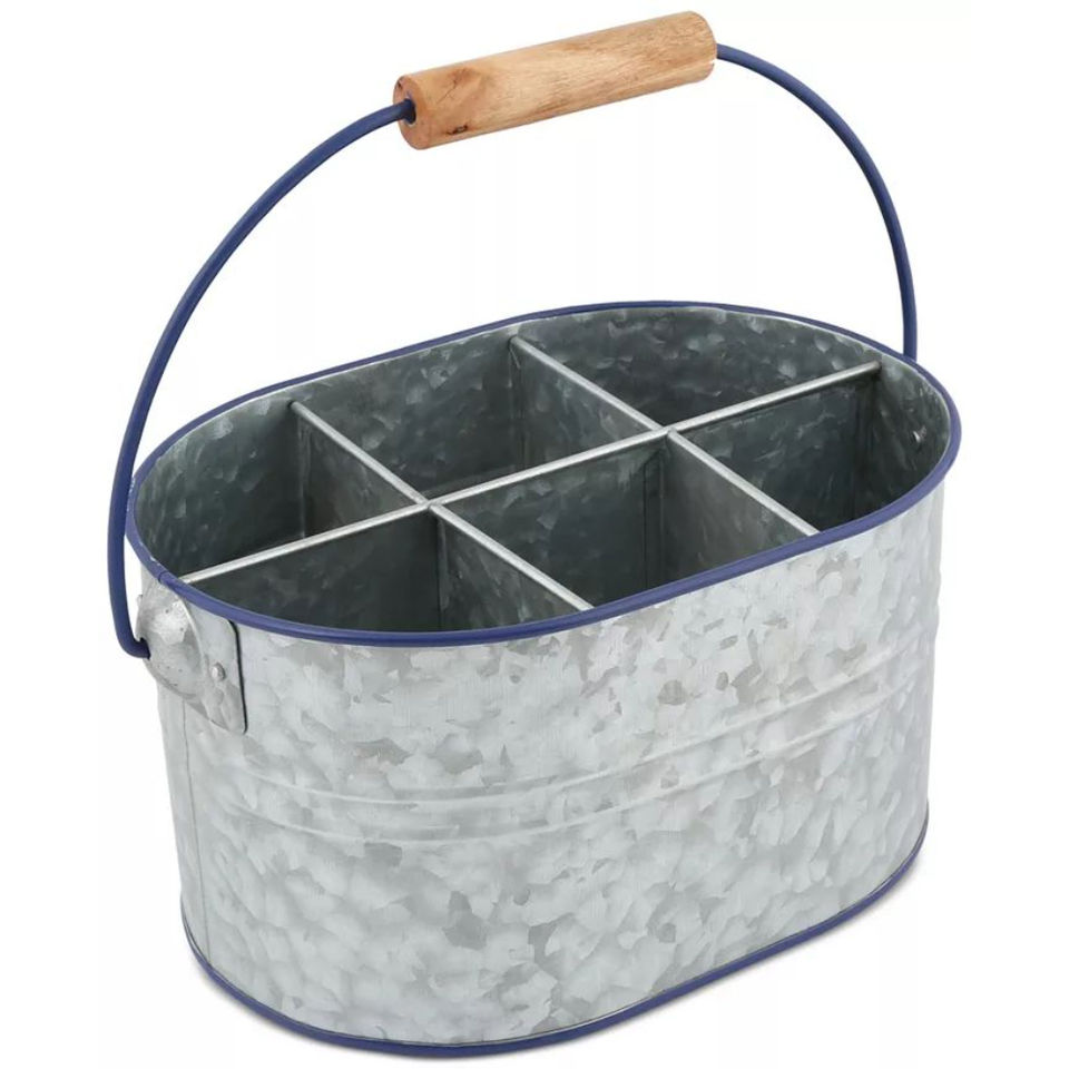 Porta Cubiertos Galvanizado de Estilo Rústico, Organizador de Utensilios con Diseño de Casa de Campo, con Asa, 3 Compartimentos, Metálico, Plateado