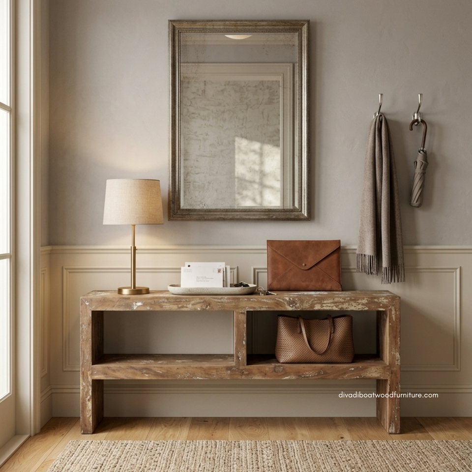 Mesa Consola de Madera de Teca Rústica, Ecológica, Hecha a Mano, Duradera, con Almacenamiento, para Sala de Estar, Entrada, Apartamento, Hotel, Mueble para el Hogar
