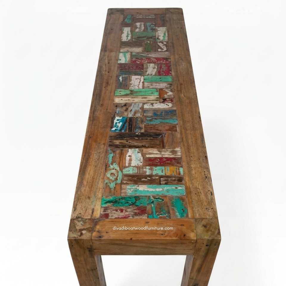 Mesa Consola Rústica de Madera de Teca con Diseño Patchwork para Sala de Estar, Entrada, Apartamento, Hotel, Muebles para el Hogar, Madera Reciclada de Barco, Venta al por Mayor
