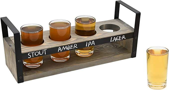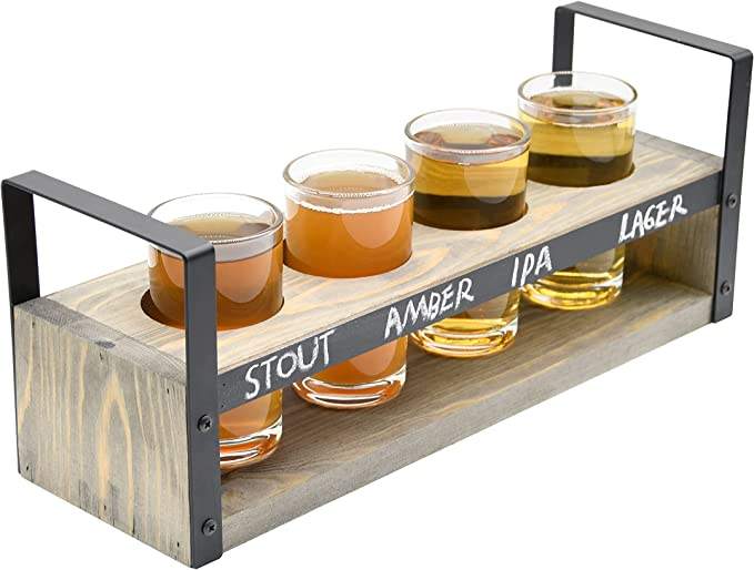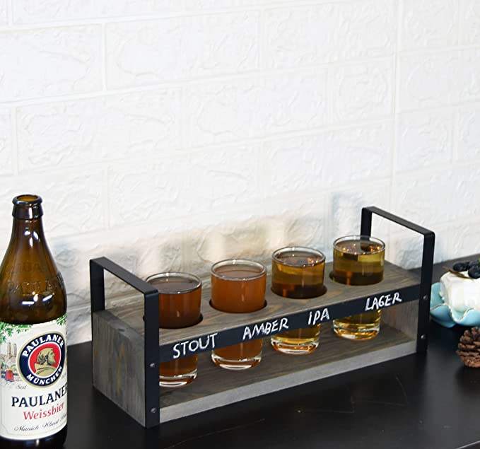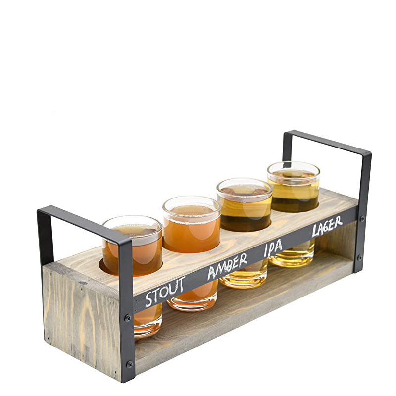 Estante para servir muestras de cerveza de madera encalada rústica con paneles de pizarra Juego de vuelo de cerveza de madera Vasos Cubos de hielo Tinas de bebidas