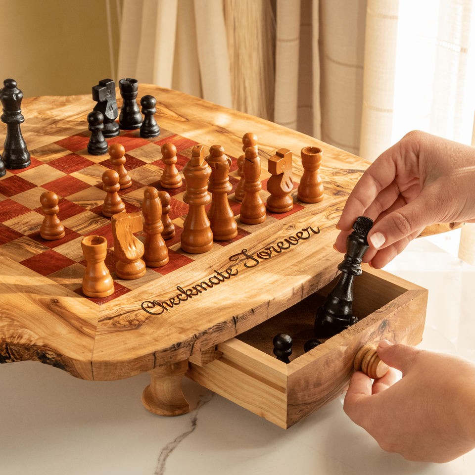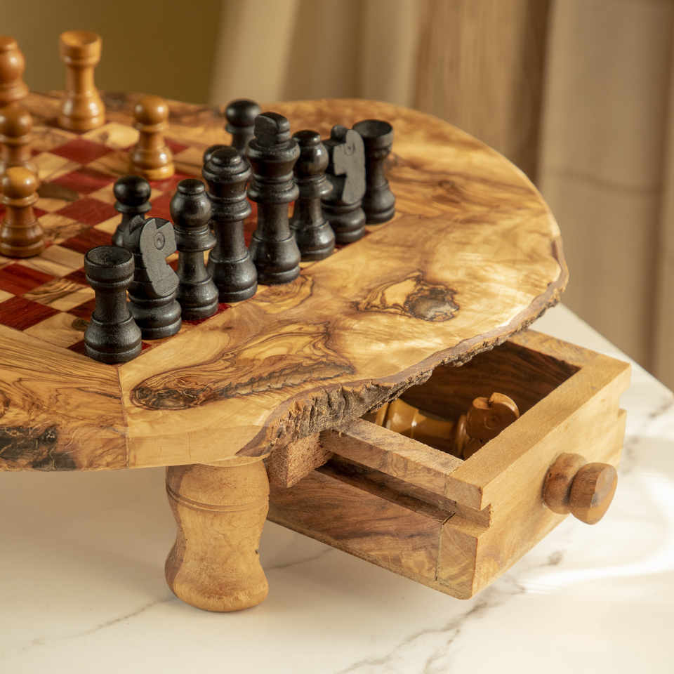 Mesa de Ajedrez Rústica de Madera con Patas y Cajones de Almacenamiento, Cuadrados Rojos, 28–50 cm, Venta al por Mayor