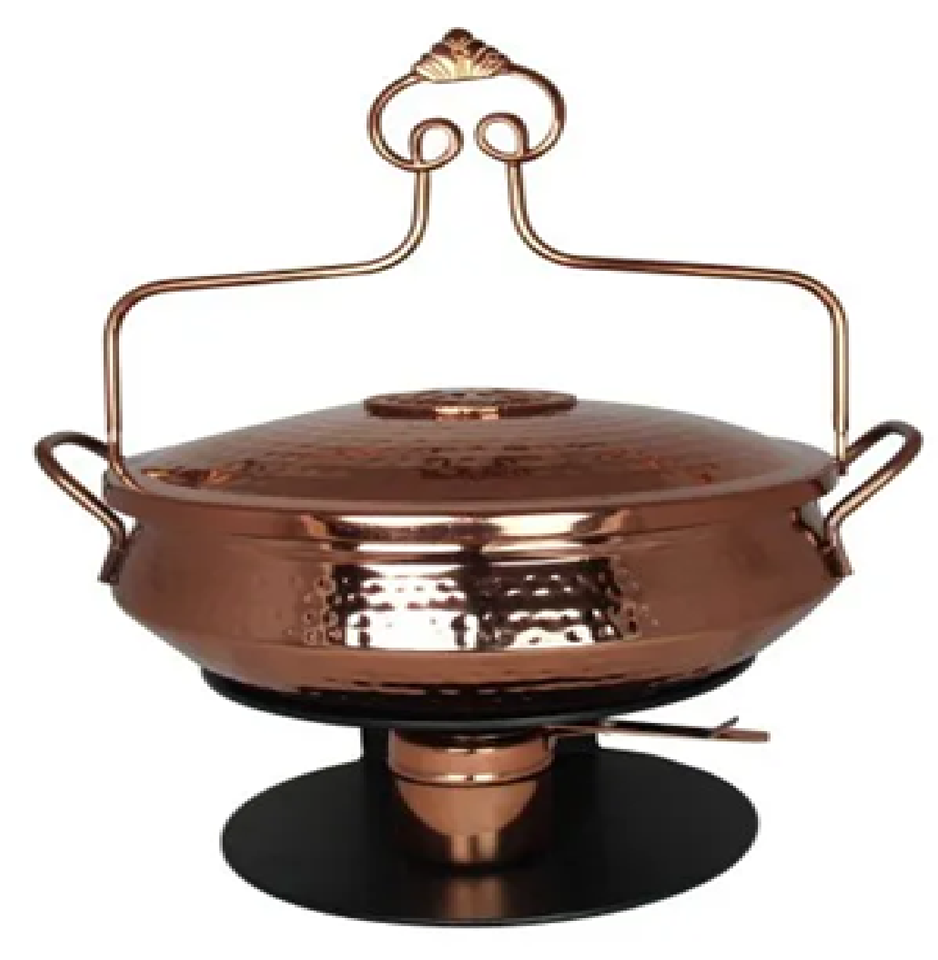 Plato de frotamiento de latón de cobre rústico con un mango decorativo, acabado martillado, perfecto para mantener la comida caliente disponible al por mayor