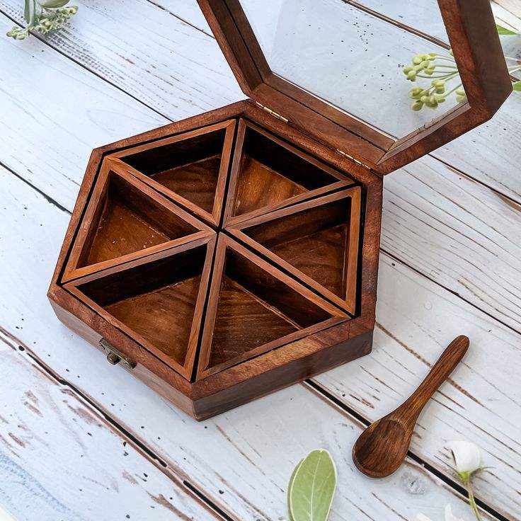 Caja de especias de madera con pieza de decoración rústica con tapa, caja de especias Hexagonal hecha a mano, contenedor de especias Masala con cuchara, accesorios de cocina