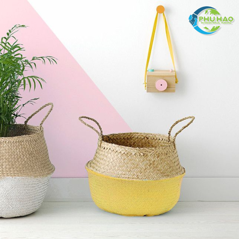 Elegancia rústica: cesta de vientre de hierba marina vietnamita hecha a mano: lavandería y almacenamiento de plantas en uno con decoración para el hogar