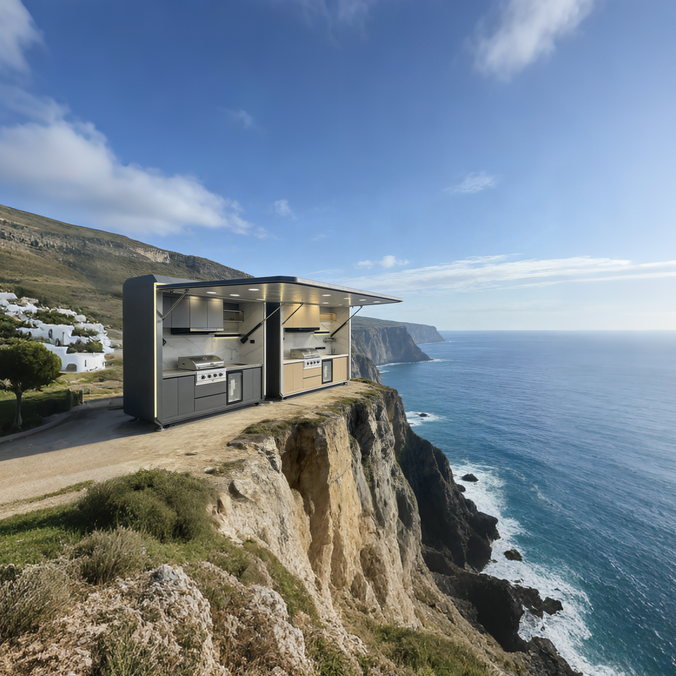 Cocina Exterior Resistente a la Oxidación con Cobertizo de Textura Metálica, Cocina Exterior con Puerta Eléctrica para Patio