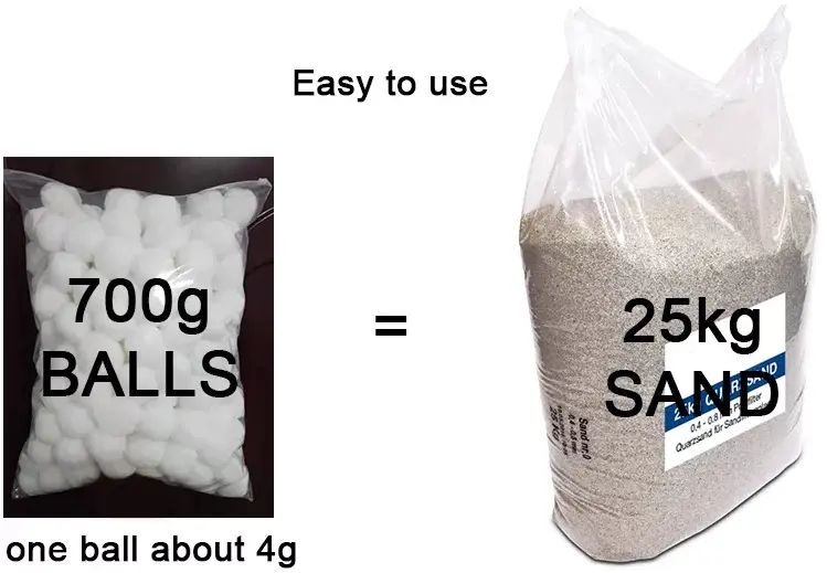 Detalles del embalaje:S419 Nave pestañas de cloro fibra de bola de poliéster para limpieza de piscina con bolsa