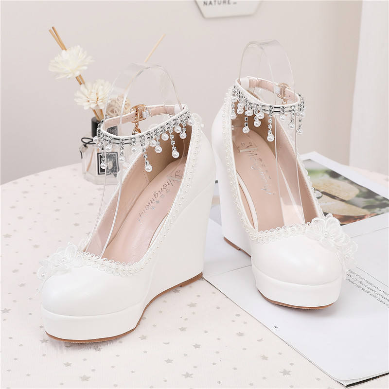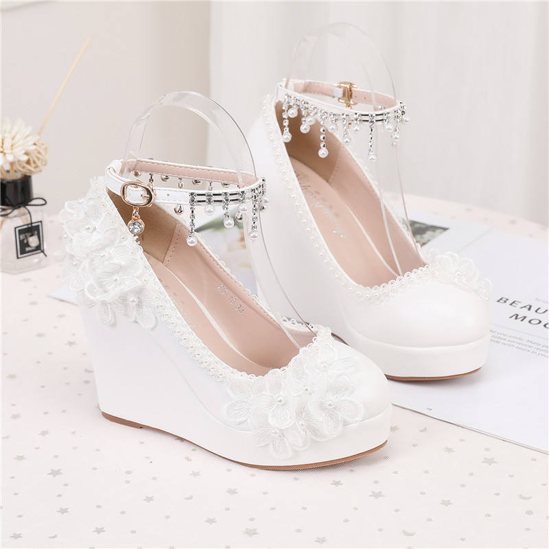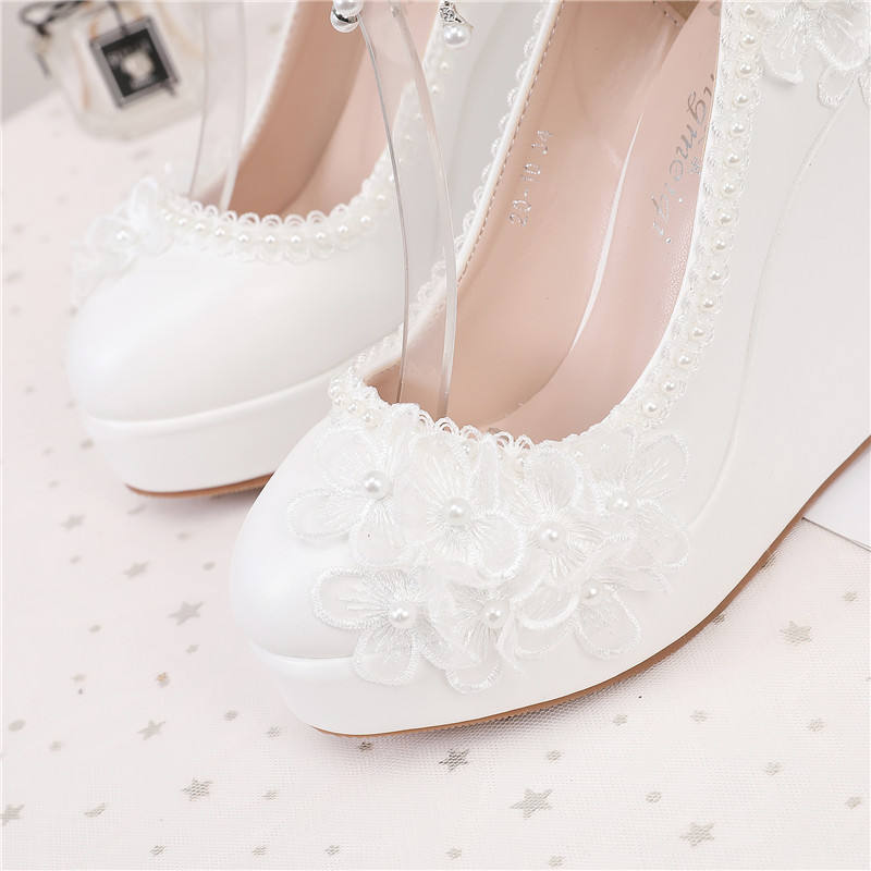 S4637F Nuevo zapato nupcial blanco de color liso para mujer: cuña, punta redonda, boca baja, talla única