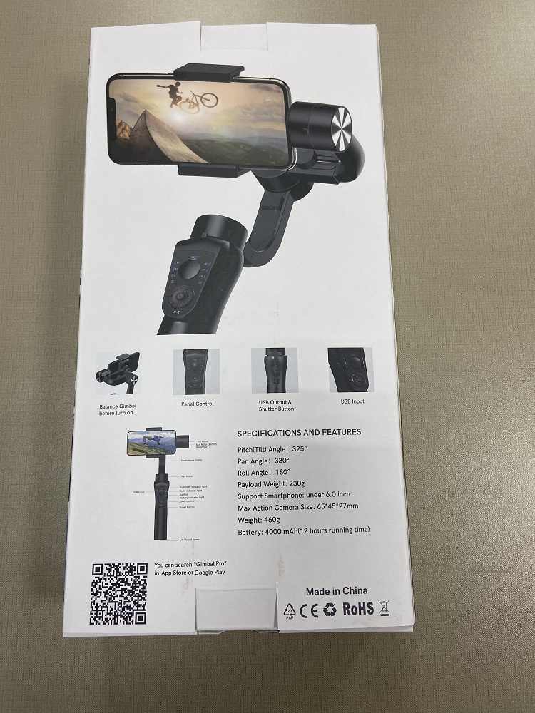 the gimbal with tripod is packed by retail color box package without logo