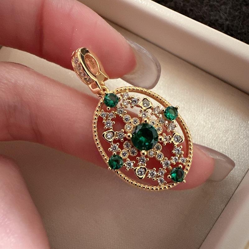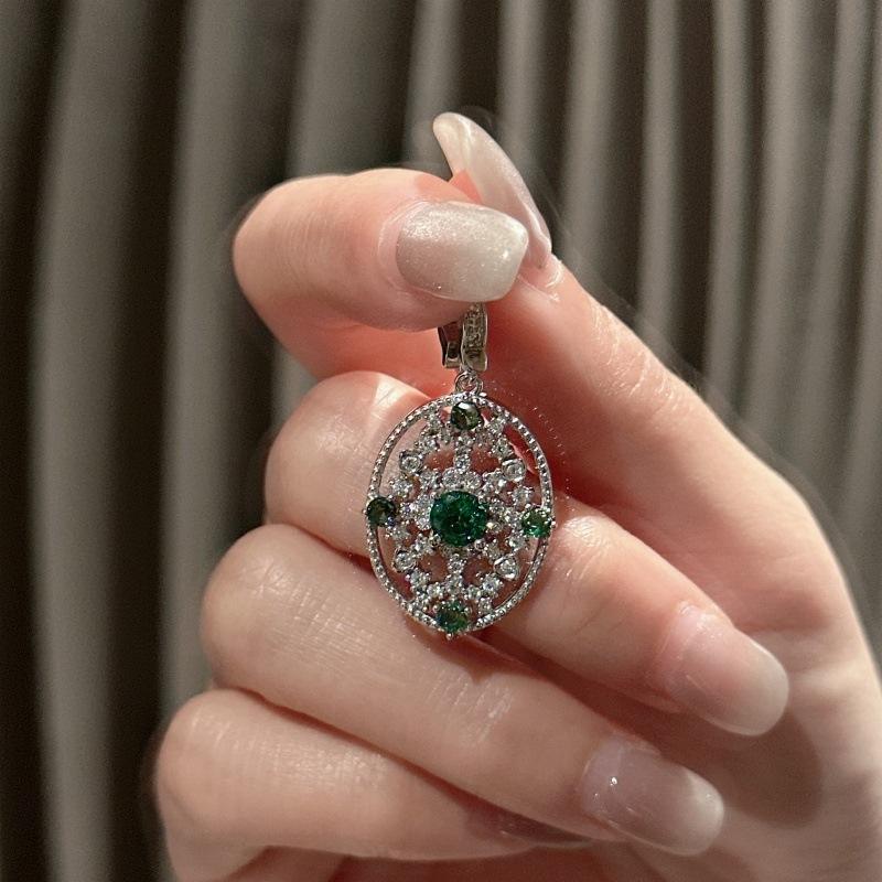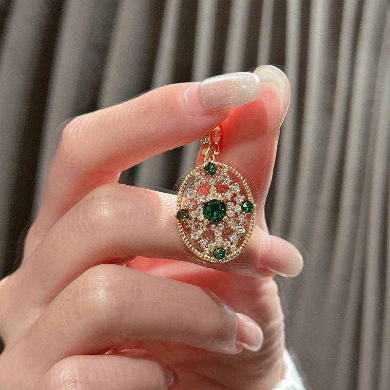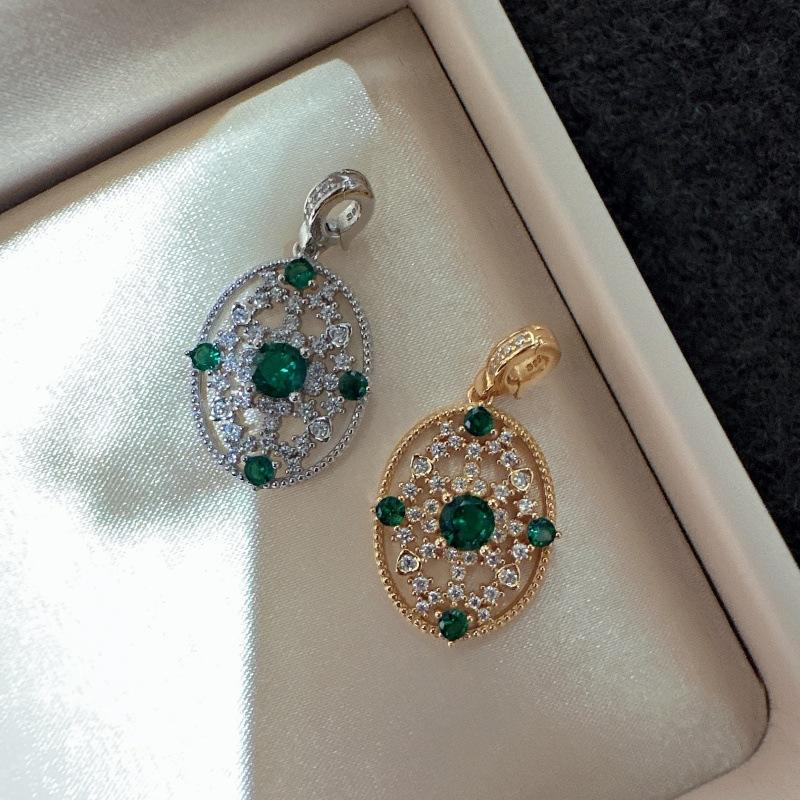Colgante de Plata de Ley S925 con Microincrustaciones de Circonita Verde, Estilo Medieval Francés, Tallado Hueco, Geométrico Ovalado, Colgantes de Moda