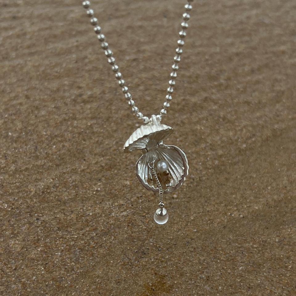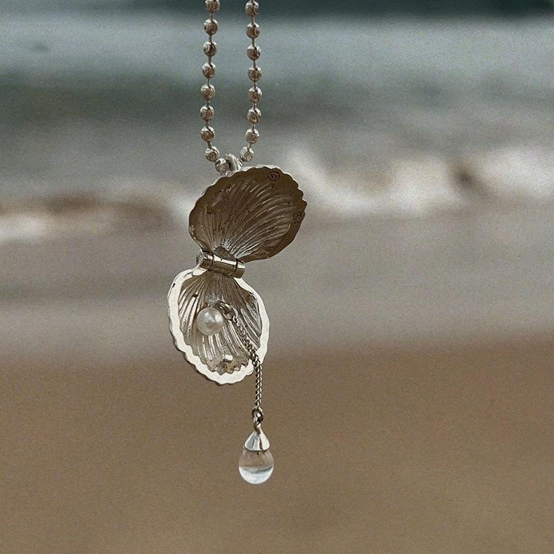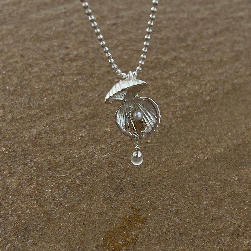 Collar de Plata de Ley S925 con Diseño de Concha de Verano, Estilo Francés Retro, Cadena con Pequeños Dijes de Flores Medievales