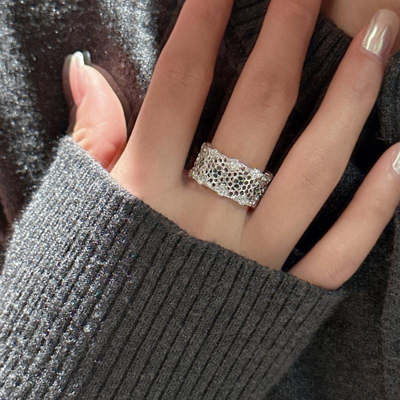 Anillo de Encaje Vintage de Plata Pura S925, Diseño de Nicho Simple y Vintage, Joyería de Incrustaciones de Cara Ancha, Ligera, Lujosa y Moderna