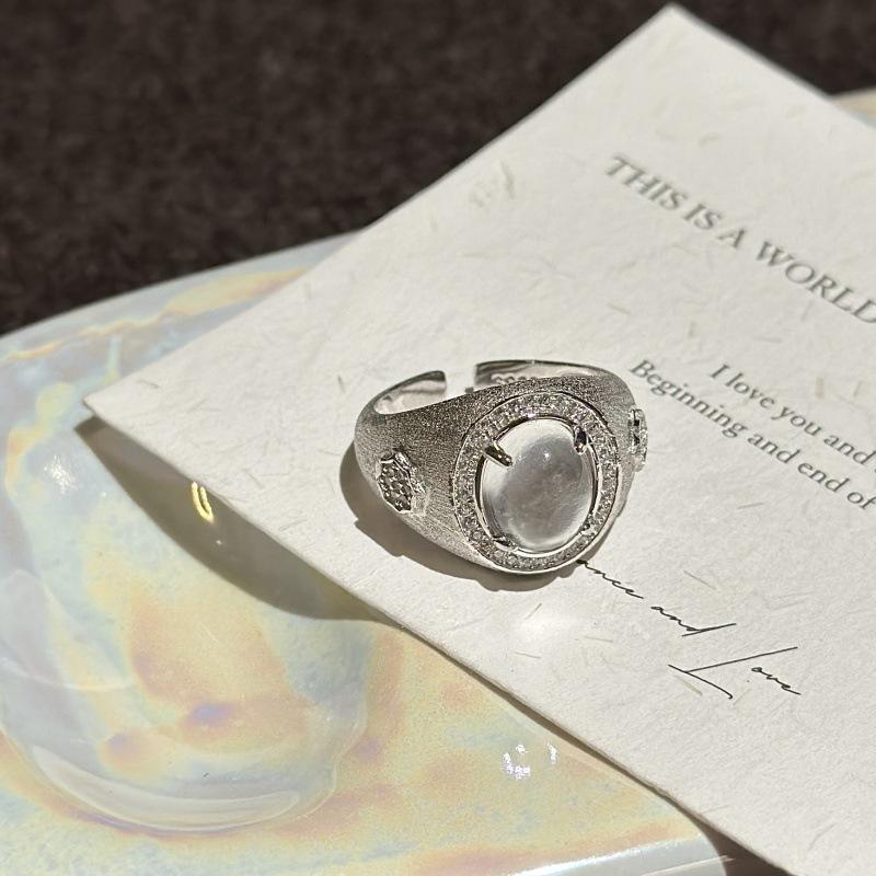 Anillo de Plata Pura S925 con Espuma de Agua y Jade, Estilo Vintage, Diseño de Nicho Simple y Moderno, Corte Ovalado con Forma de Diamante, Acabado Cepillado con Efecto de Huella Dactilar