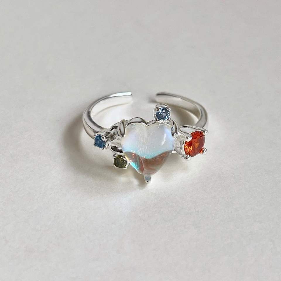 Anillo Abierto de Plata de Ley S925 para Mujer, Diseño Dulce y Original con Corazón de Piedra Lunar y Cristales de Circonio Coloridos con Microincrustaciones