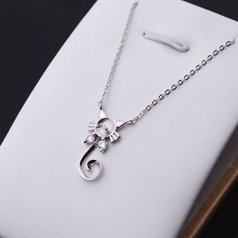 Collar con Colgante de Gato de Plata S925 con Bandeja Vacía para 6-7 Perlas, Cadena para Accesorios DIY, Joyería Fina para Mujer