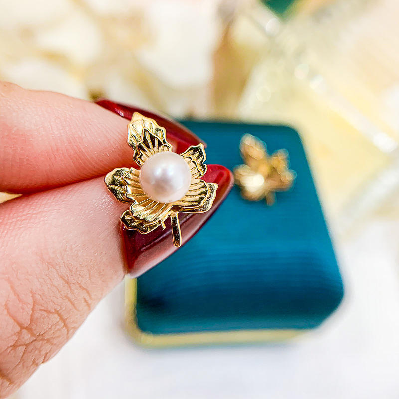Accesorios de Plata S925 para DIY, Bandeja Vacía para Perlas con Cuentas Redondas de 5-6mm y Hoja de Arce para Hacer Pendientes de Moda-20980