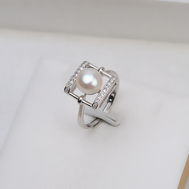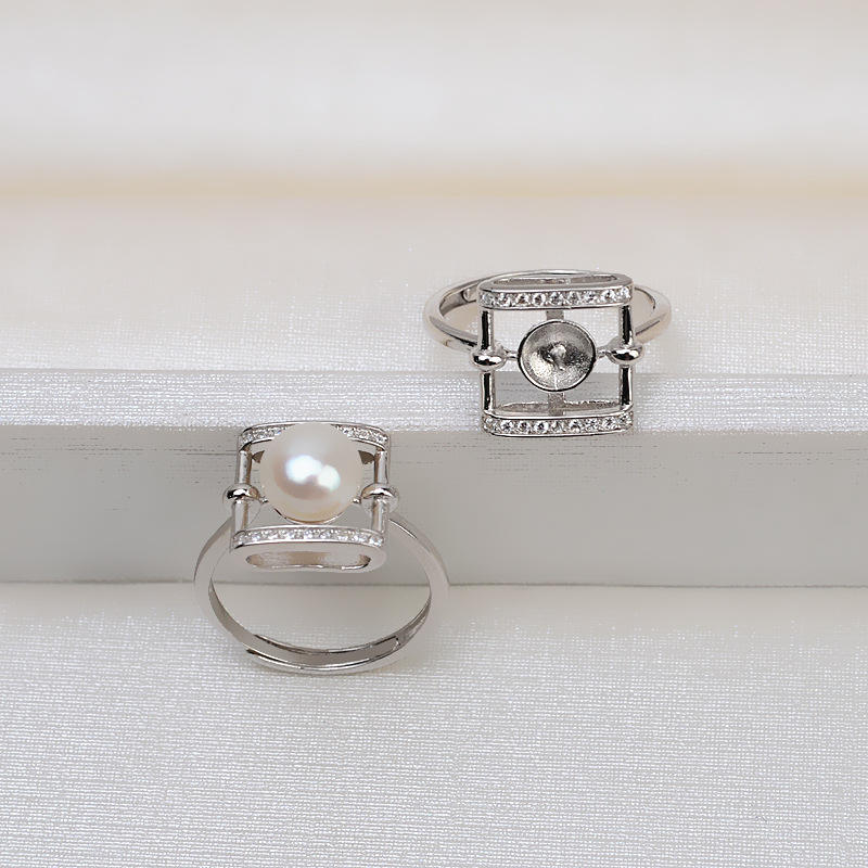 Anillo de Plata S925 con Forma Cuadrada Abierta para Cabello de Bebé, con Perla de 8-9 mm, Accesorios de Joyería DIY con Bandeja Vacía, Colección Tide 1516