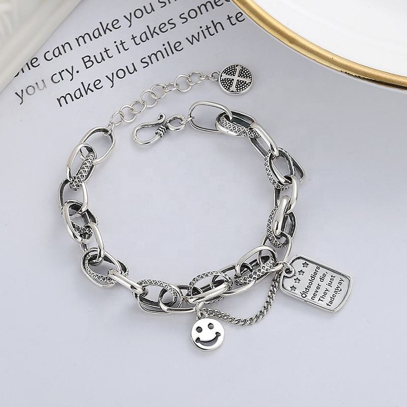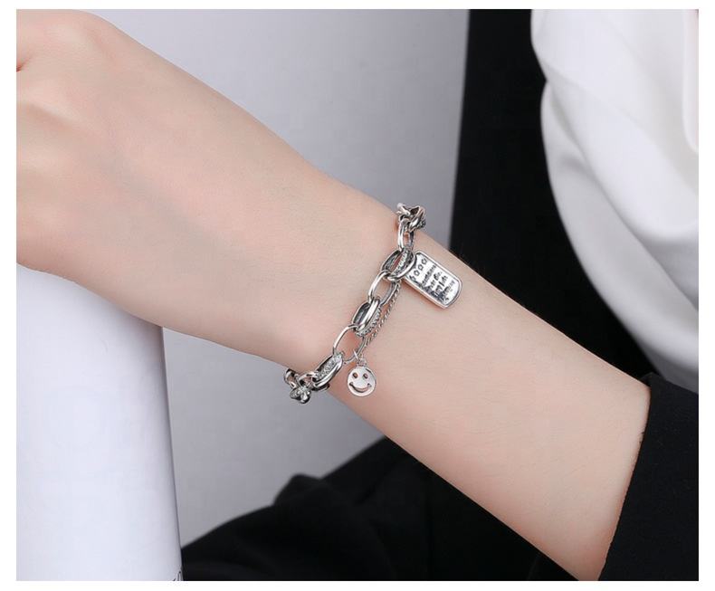 S925 plata esterlina creativa doble anillo empalme cadena borla cara sonriente cuadrado marca inglés patrón pulsera para mujer