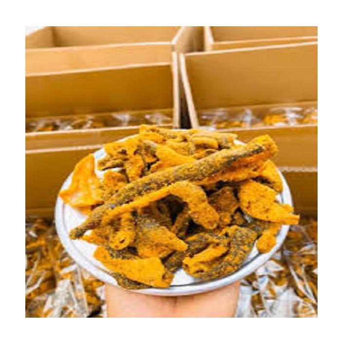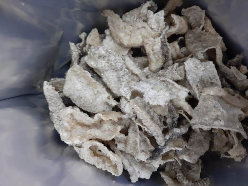 Ingredientes:Piel de pescado, yema de huevo, saté.