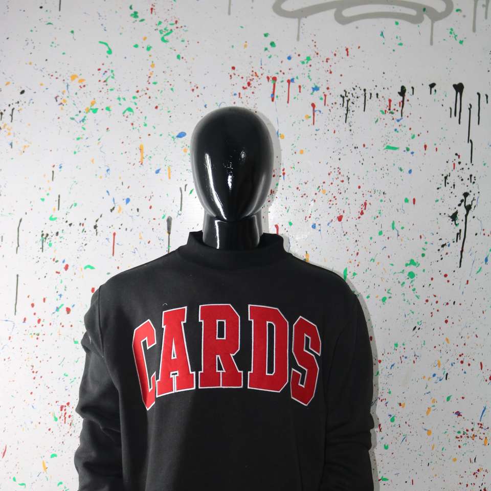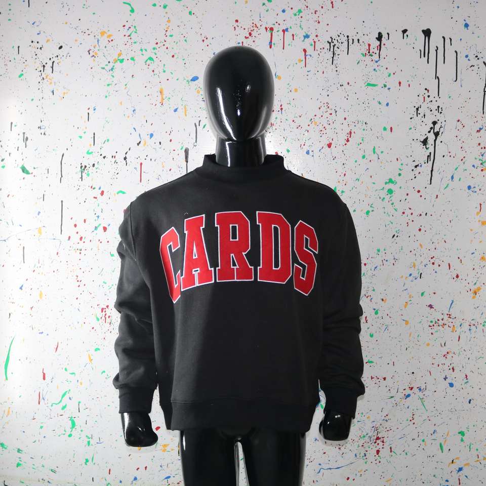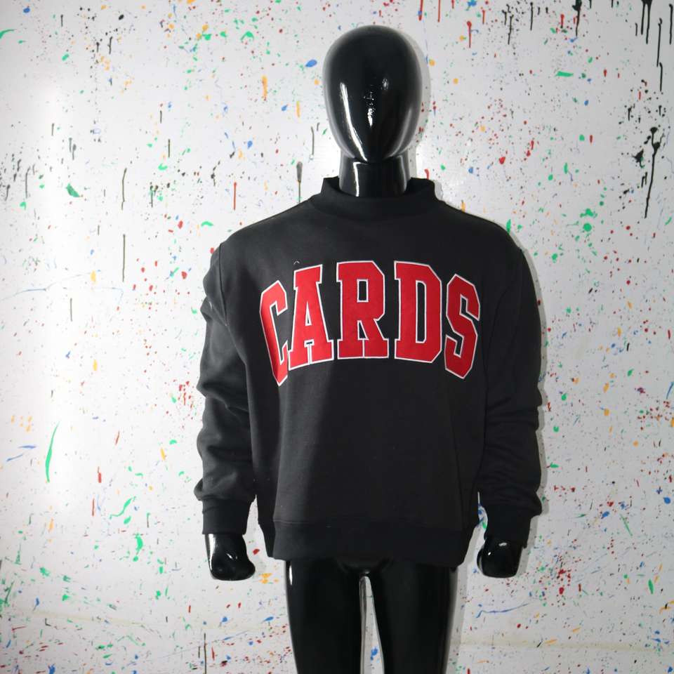 Sudadera negra con cuello alto CARDS BLACK, 100% roja, con apliques bordados, cuello ancho, hilos finos.