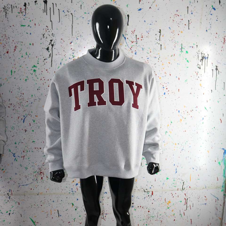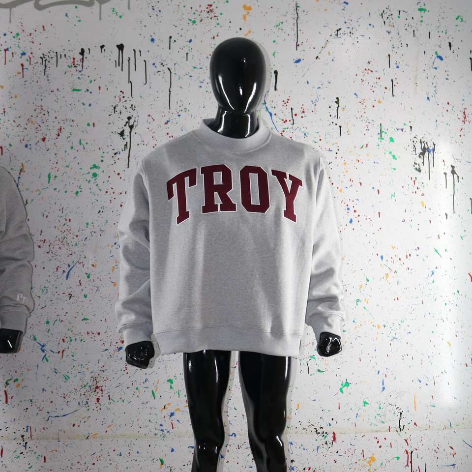 Sudadera TROY ASH GREY con cuello alto, 100% bordado con apliques marrones, sudadera de cuello ancho con hilos finos