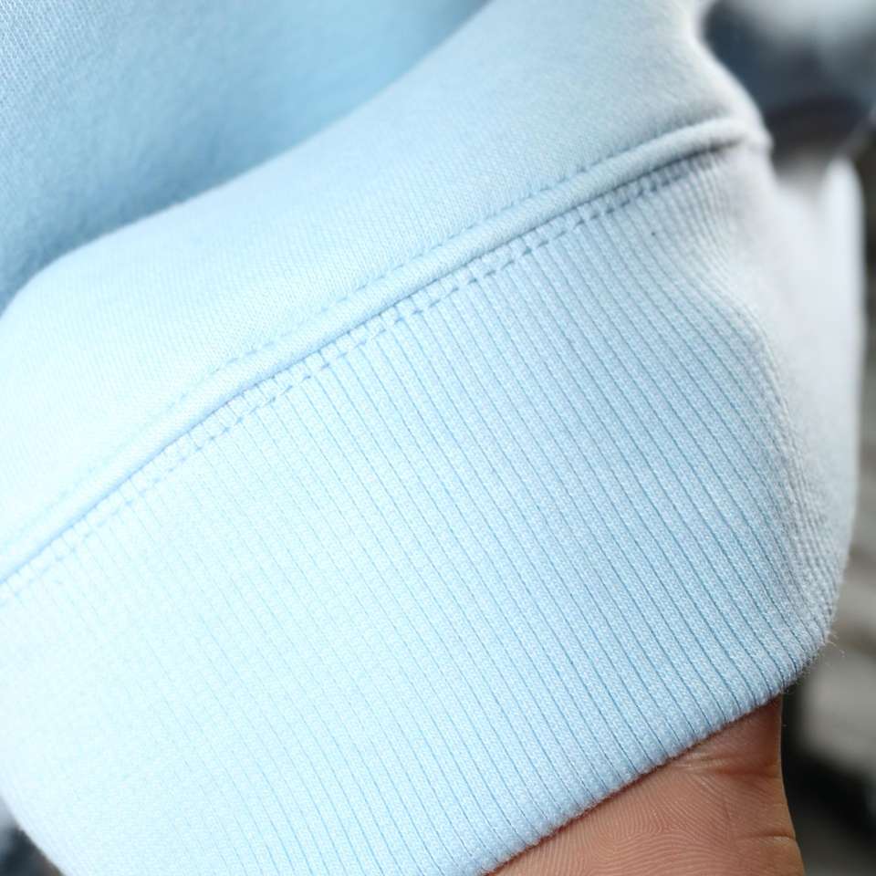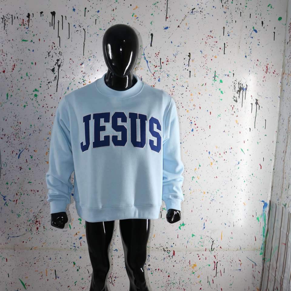 Sudadera JESUS SKY BLUE con cuello alto, 100% azul marino, con apliques bordados, cuello ancho, hilos finos.