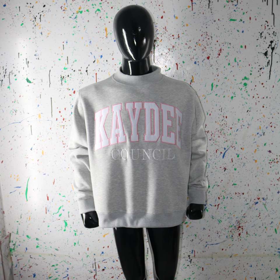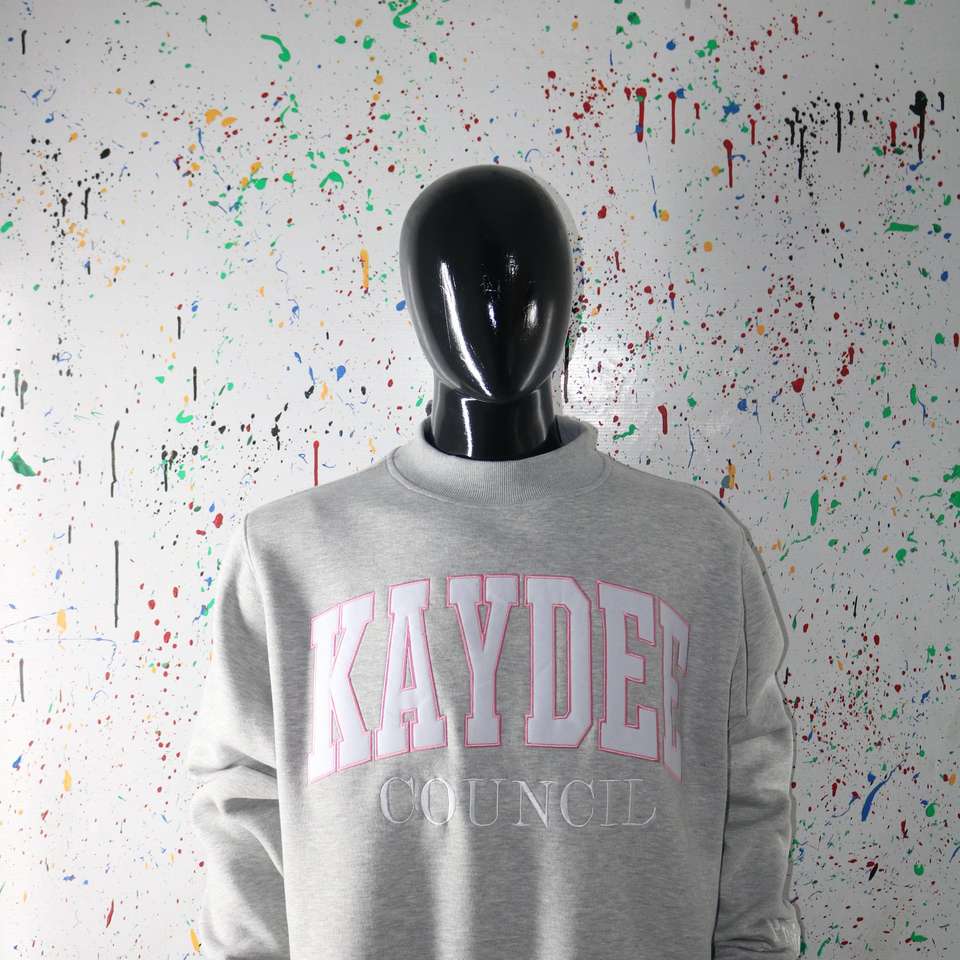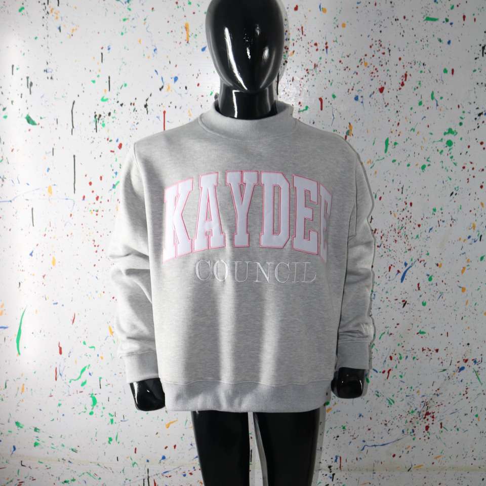 Sudadera KAYDEE HEATHER GREY con cuello alto y apliques bordados en blanco, sudadera de cuello ancho URBAN PRODUCTIONS