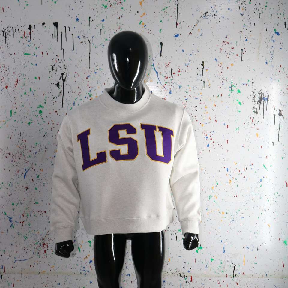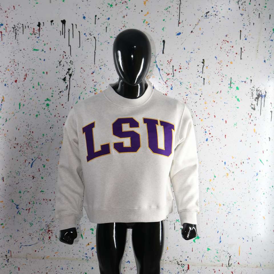 Sudadera LSU ASH GREY con cuello alto, 100% algodón, bordado con apliques morados, cuello ancho, CLUSH SPORTS