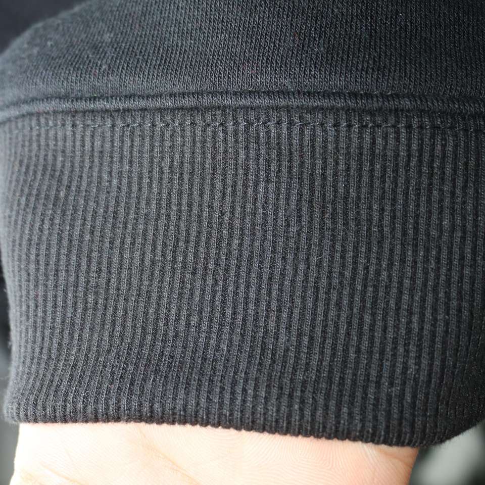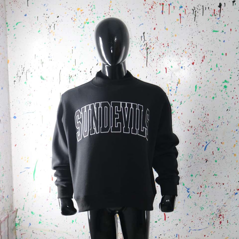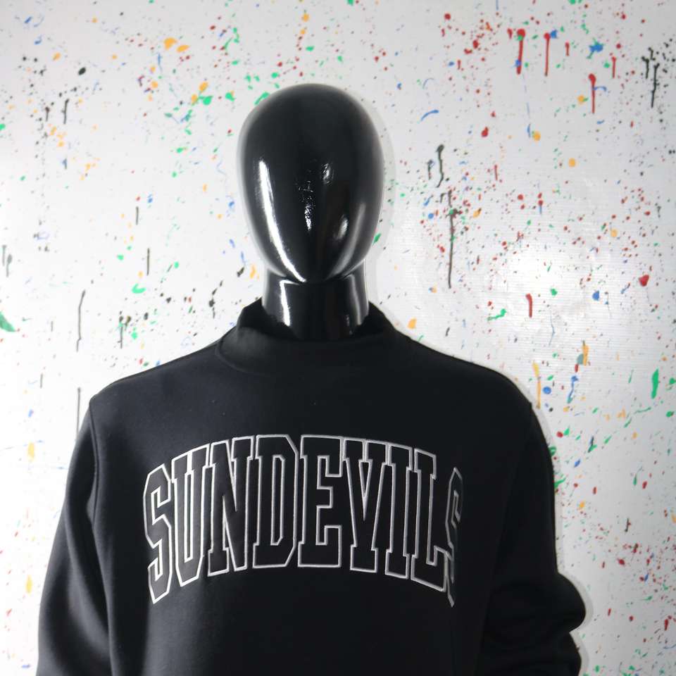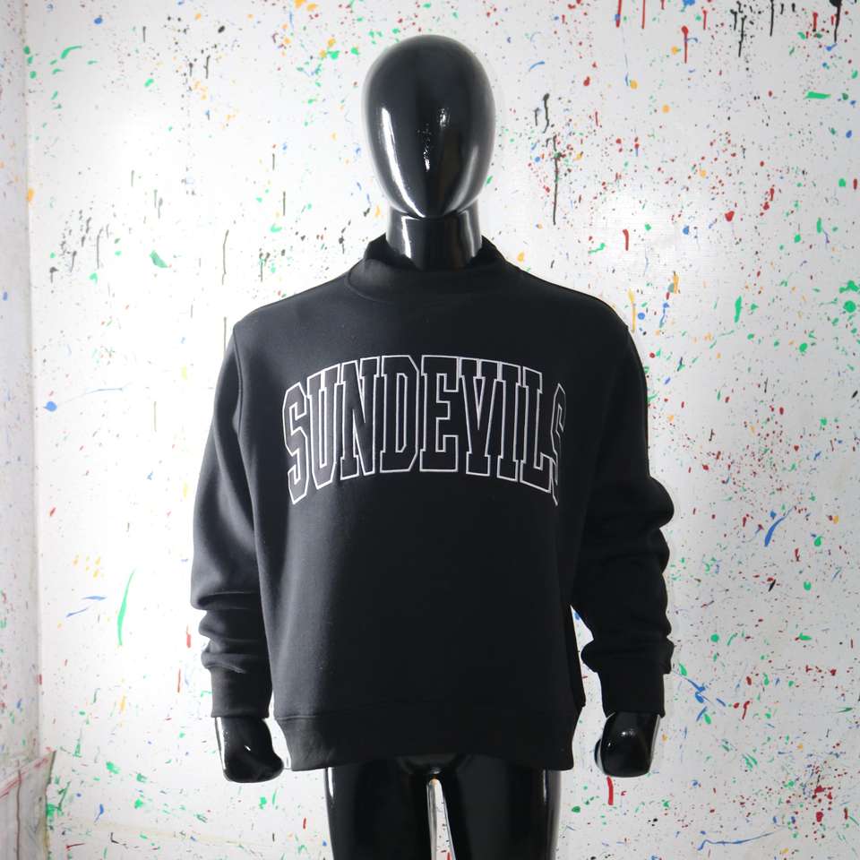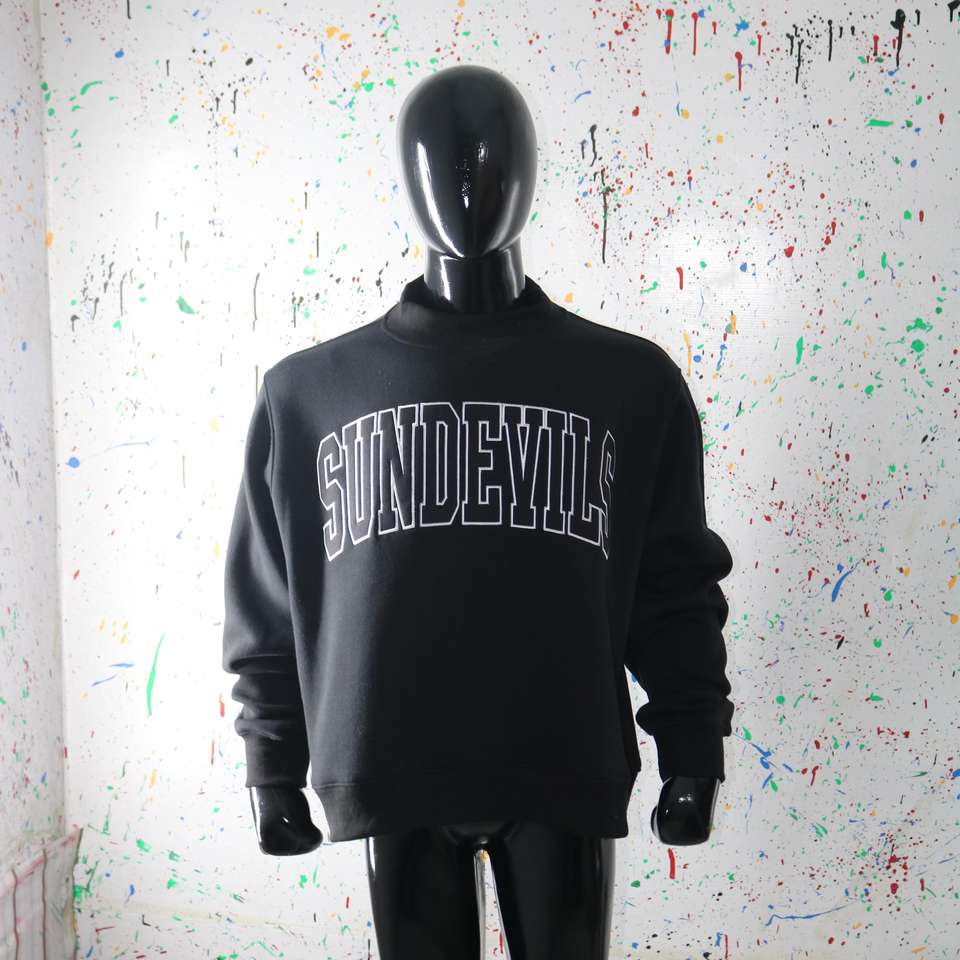 Sudadera SUNDEVILS BLACK con cuello alto, 100% negra, con apliques bordados, cuello ancho, hilos finos