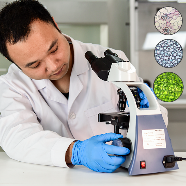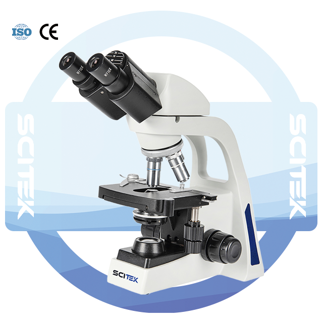 Microscopio biológico SCITEK con cabezal binocular sin compensación, lámpara LED, ocular de campo amplio y mesa mecánica de doble capa para laboratorio.