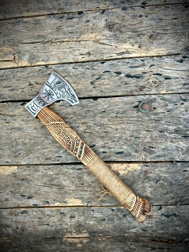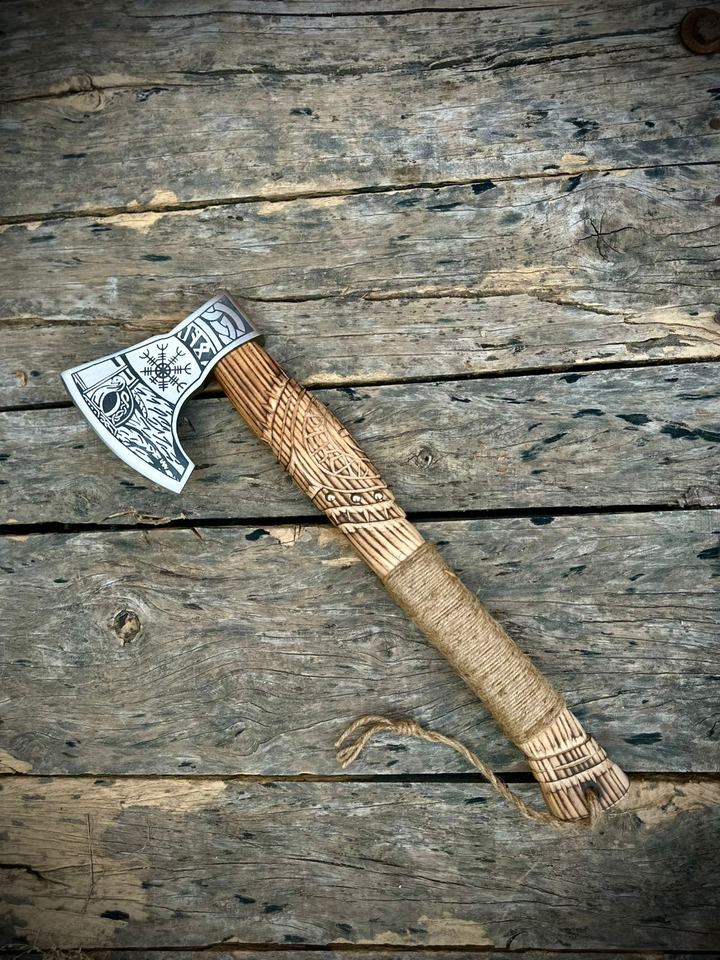 Hacha vikinga de acero al carbono de grado Industrial hecha a mano SCL, mango de madera de doble hoja, hacha grabada para caza y Camping multiusos