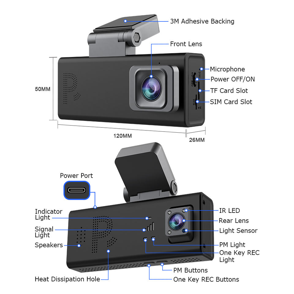 Cámara de Seguridad para Auto SECTEC con Detección de Radar, GPS, 4G, Ranura para Tarjeta SIM, Lente Dual de 6MP, Visión Nocturna, Grabación Frontal y Trasera 24/7