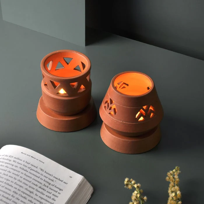 Juego de 2 (SAMARA - VIPASSANA) - Lámpara de terracota artesanal para velas de té, ideal para tu mesa de estudio, mesa de comedor o mesa auxiliar.