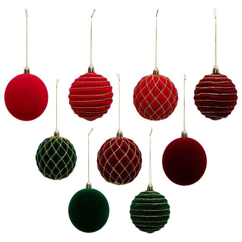 Juego de 9 bolas de poliestireno y tela verdes y rojas, diámetro. 8 cm