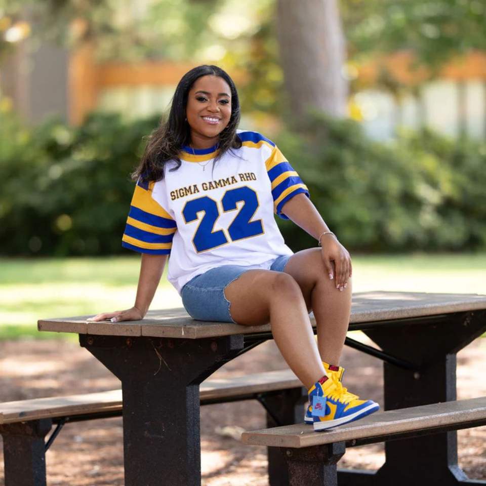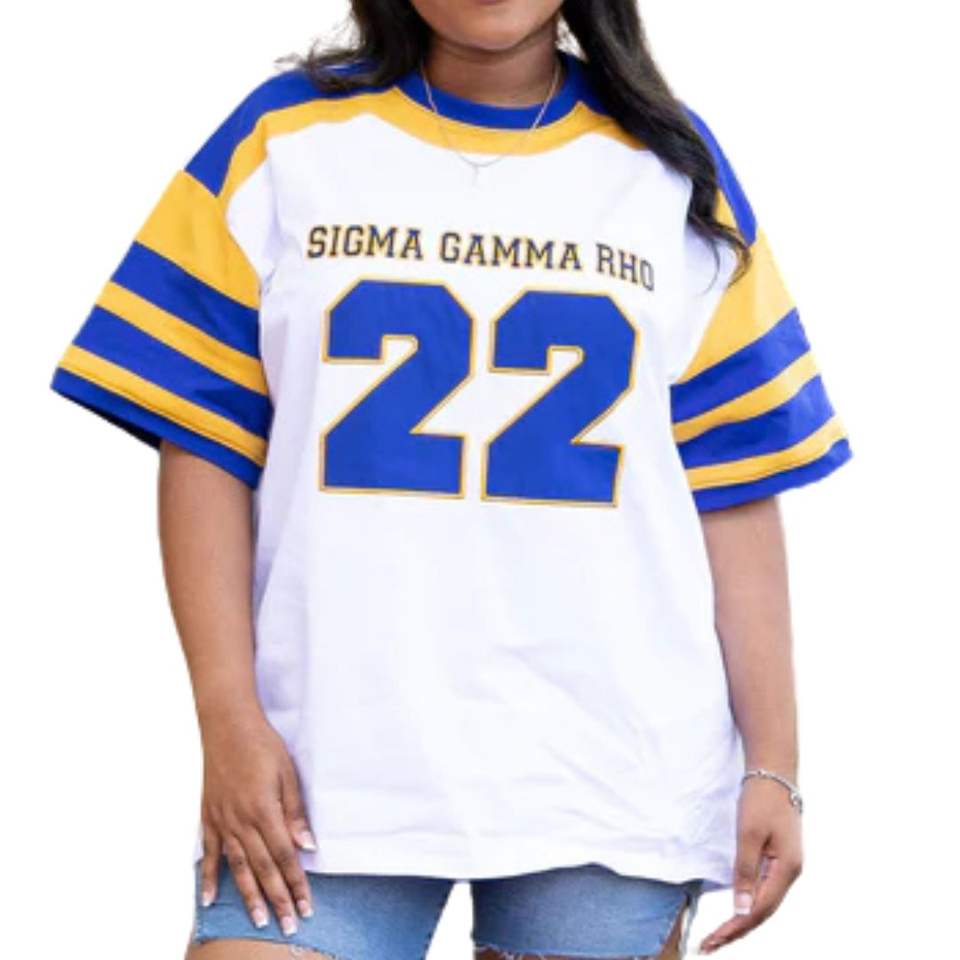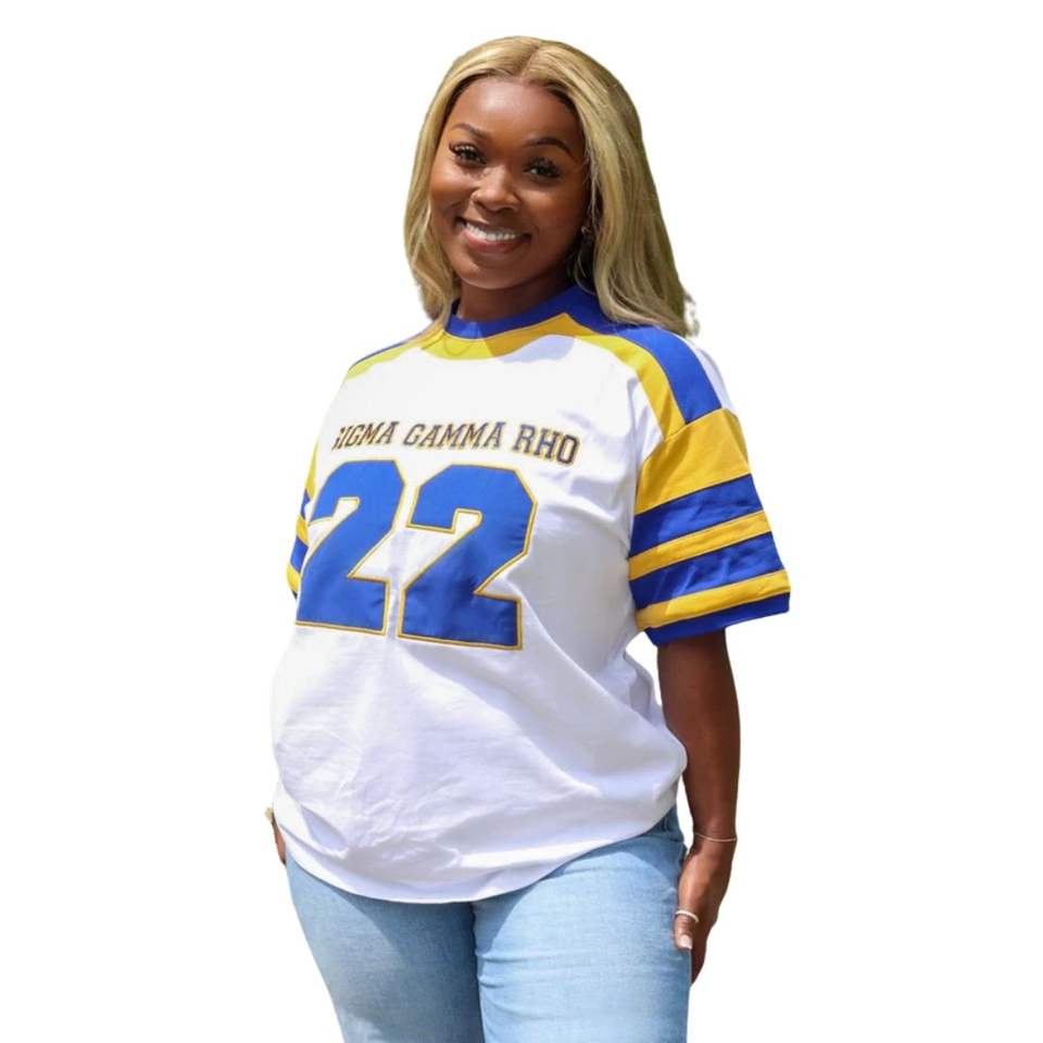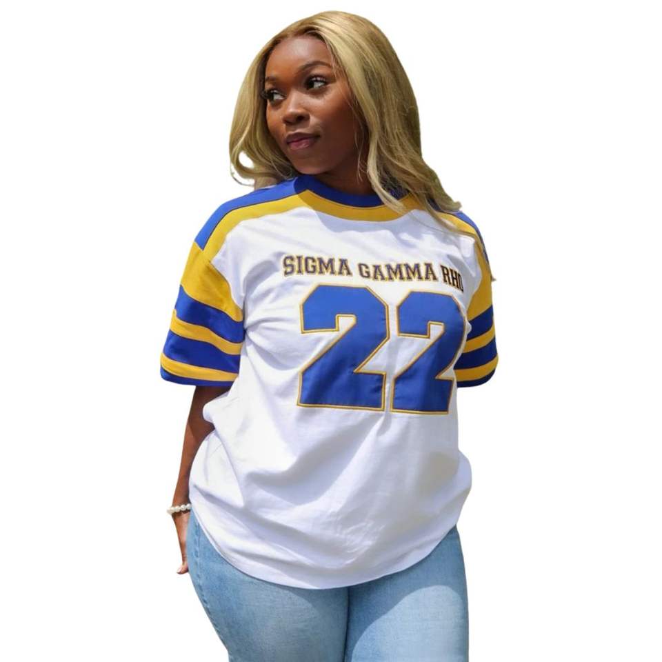 SGRHO Camiseta de hockey para fanáticos de la Hermandad de mujeres Algodón Ajuste relajado Azul Oro Jersey Estilo Ropa griega para el día del juego y ropa informal