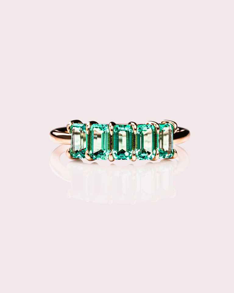 SHIVPATH Nueva llegada 14K Oro sólido Chapado en oro rosa Cinco piedras Corte Esmeralda Anillo de diamante de moissanita verde para bodas